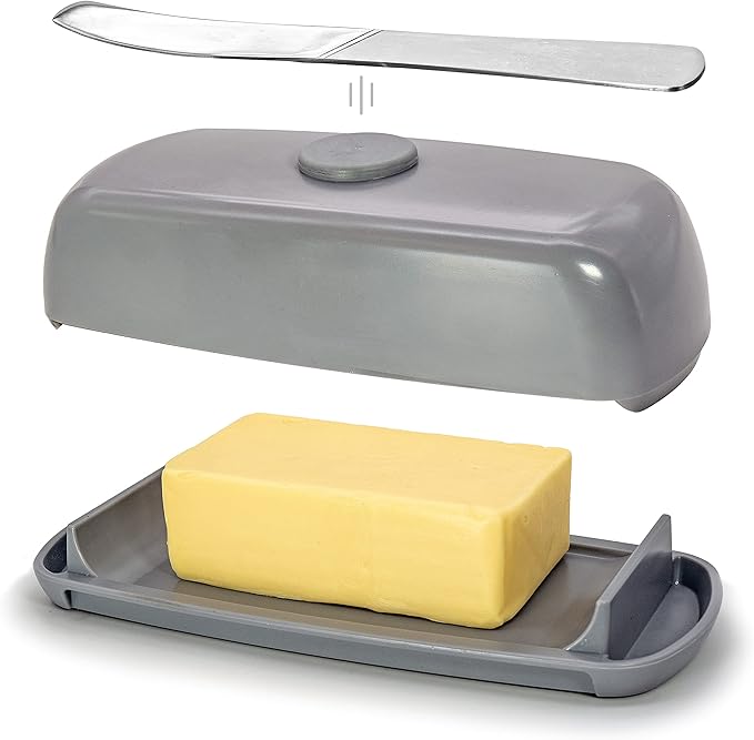 - QUALITY AND SAFETY: Our butter dish with cover is food safe, BPA free, and dishwasher safe; Soft rubber feet hold the butter dish in place during use; Unlike ceramic butter dishes, our plastic butter dish is light, quiet, and won t get shattered by curious cats; Easy to carry with one hand, knife and all. NOT microwaveable. This product is not suitable for children aged 13 and under.