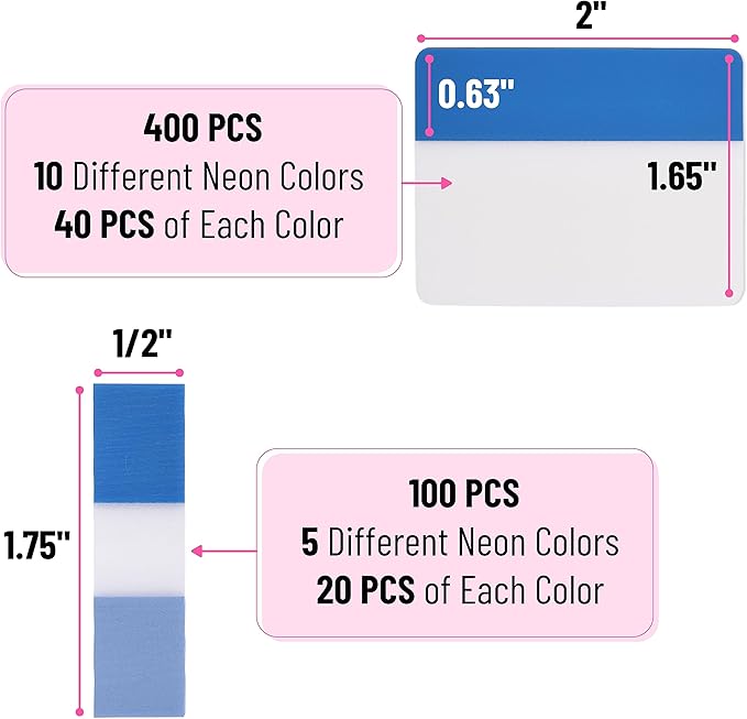 - Package includes 500 pieces of sticky tabs in 21 sets, 400 pieces of 2-inch tabs in 20 sets with 10 different neon colors, and 100 pieces of 0.5-inch tabs in 1 set with 20 pieces of each color.
