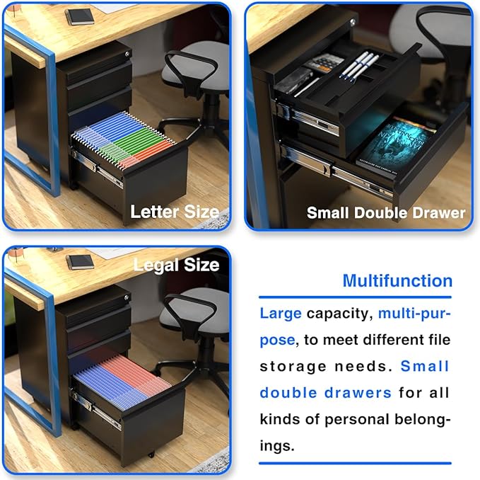 - Effortless Mobility with Advanced Wheels: Equipped with five 360-degree rotating wheels (including 2 lockable front wheels and a center wheel designed to prevent anti-tipping), this under desk file cabinet moves smoothly without producing noise, offering stability and ease of use in any workspace;
