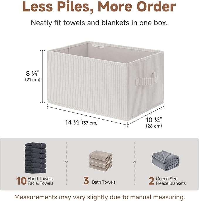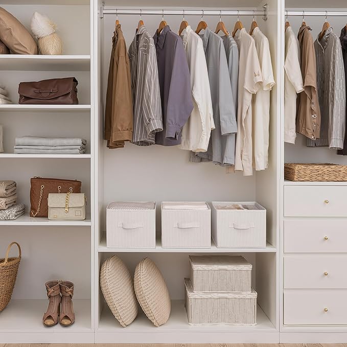 StorageWorks Storage Baskets for Shelves, Foldable Fabric Closet Storage Bins with Handles, Fabric Storage Bins Clothes Organizer, Beige Stripes, 3-Pack, Large