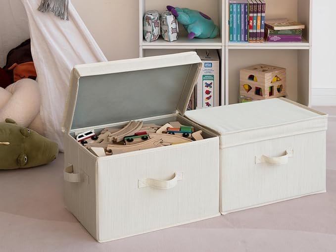 - Dust-proof storage bins feature flip-top lids and 3 sewn-in handles on the front, back and left side, making it easy for you to carry the storage bins.
