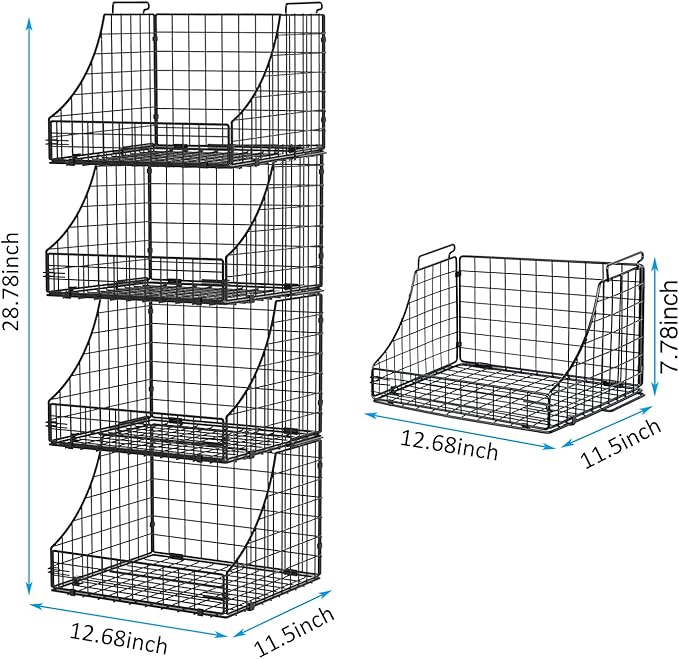 - Dimensions and Care: This wire basket set includes three baskets, each in a unique size: 12.68" L x 11.5" W X 7.8" H. Stacked, they measure 12.68" L x 11.5" W x 28.78"H. Maintenance is a breeze; simply wipe them down with a damp cloth to keep them looking their best.