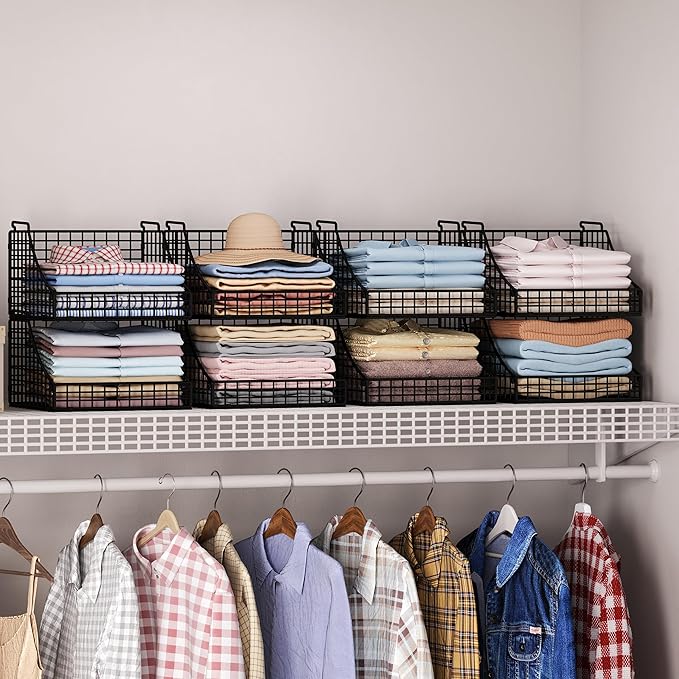 4-Pack Stackable Wire Baskets for Closet Organizers and Storage, Open Storage Bins for Clothes, Toys, and Snacks - Rustic Metal Closet Organizer and Shelves in Black