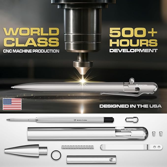 - COLLECTION READY BOLT-ACTION PENS: Our extremely satisfying ‘bolt action’ mechanism provides a secure lock without parts that wear out. Exclusive, reliable, and personifies timeless design shaping the future with functionality and simple design are all BASTION Bolt-Action Pens. Available: Pure Stainless Steel & Carbon Fiber Outer Body, Titanium, Brass, Copper, Fountain, or Mechanical Pencil.