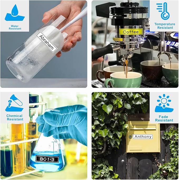 - For Indoor and Outdoor: Such as office supplies, lab appliances, wardrobe, kitchenware, etc. Compatible with Brother 12mm label tape gold/black/white has split-back design, is easy to peel and use. Print clearly and no sticky residue when Ptouch tape 12mm is removed.