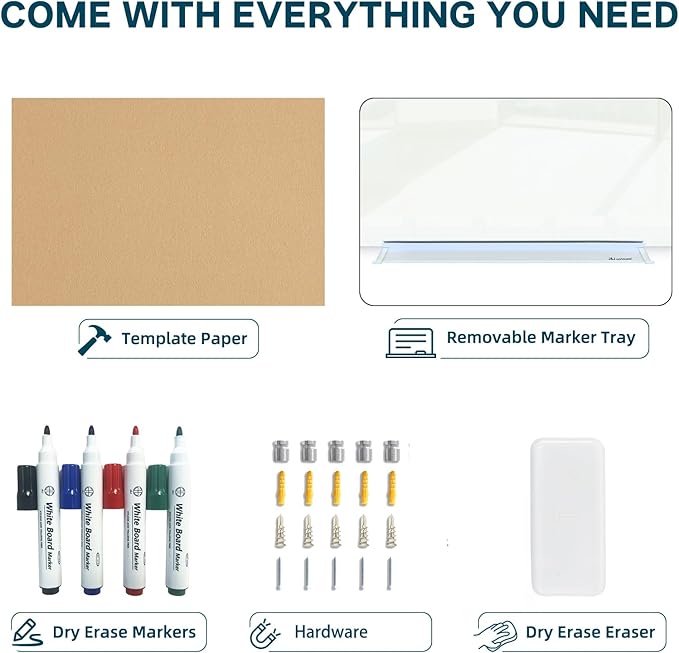 - 【ACCESSORIES INCLUDED】: 4 dry erase markers, 4 magnets, 1 glass whiteboard eraser, 1 removable aluminum marker tray, 1 template paper for mounting. One-stop shopping. t's a great gift idea for your workmate, boss or spouse which can enhance the office/ house atmosphere