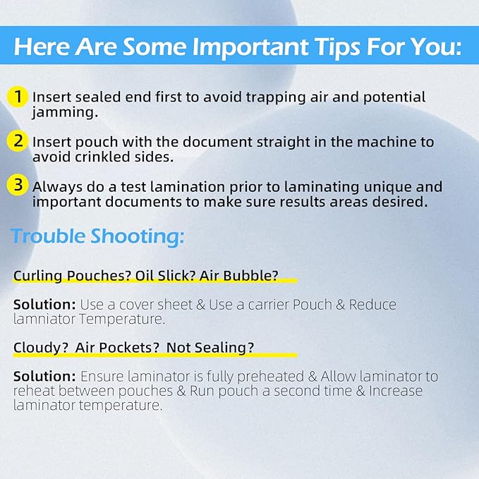- EASY To USE: Just put the document into the pouch and send it through the laminator to seal. No cracks, no bubbles and no wrinkles.