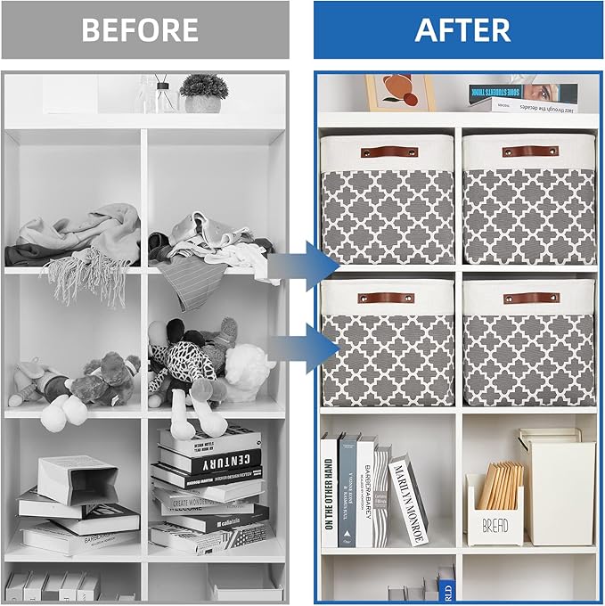 Temary 13ラ13ラ13 Foldable Storage Cube Baskets Fabric Cube Storage Basket for Organizing Cloth Storage Bins with Leather Handles for Gifts Empty, Closet (Grey Lattice)