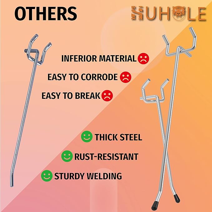 - Thick Steel:Our pegboard hooks are made with thick & solid steel that allows years of use without bending or deforming. On the other hand, our pegboard tool organizer are galvanized steel hooks that ensures anti-corrosion&rust-resistant.