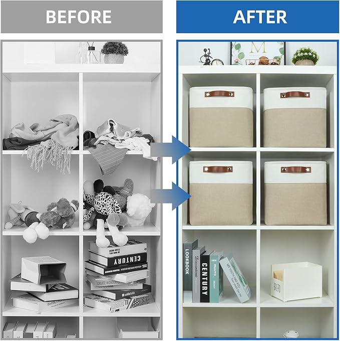 Temary 11 x 11 Cube Storage Bins Fabric Storage Baskets 4 Pack Cubes Baskets with Handles for Organizing Clothes, Organizer Bins for Storage (White&Khaki)