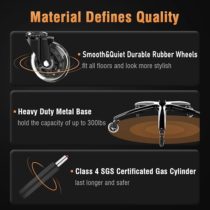 - 【Durable Chair For Most People】With a durable metal base, a heavy-duty gas cylinder, and smooth-rolling racing-style wheels, our work chair is made to last. It is extra-sturdy and stable and makes a long-lasting office accessory. The 300-pound weight capacity accommodates people with big or large body types, and the wide seat makes getting in and out easy