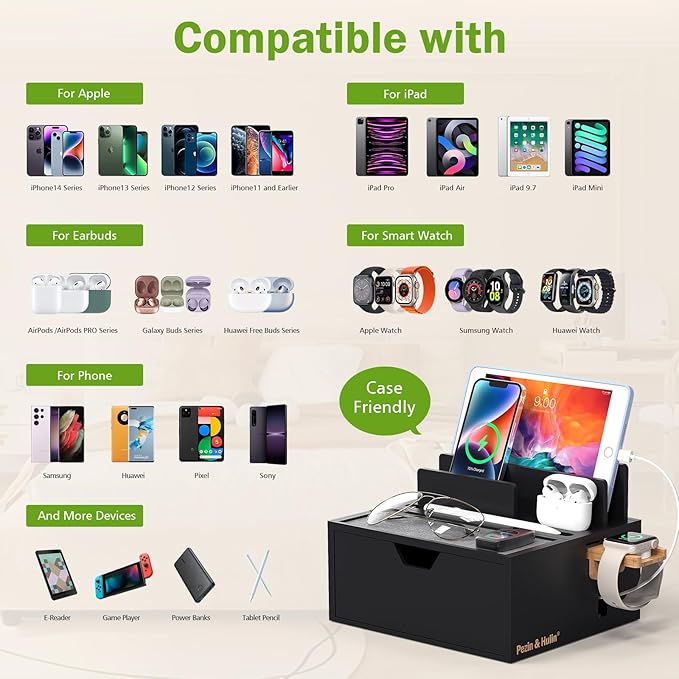 - Multi-device Organizer: Pezin & Hulin bamboo charging station stand can hold up to 7 devices (such as phone, tablet, smartwatch, earbuds, and more electronic devices), simultaneous maintaining your devices in order and helps to clean up the stacking device charging