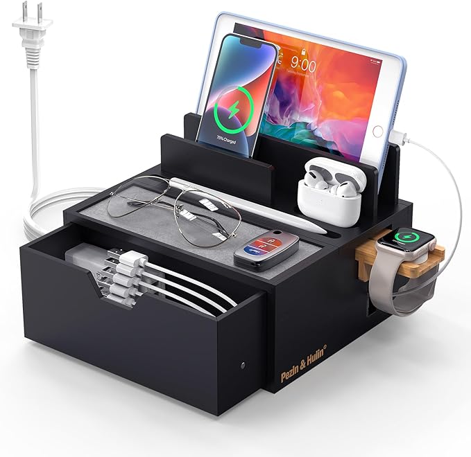 Pezin & Hulin Bamboo Charging Station for Multi Device with 5 USB Charger HUB, Phone Docking Station with Lined Tray & Drawer(Include 5 Charger Cables)-Black