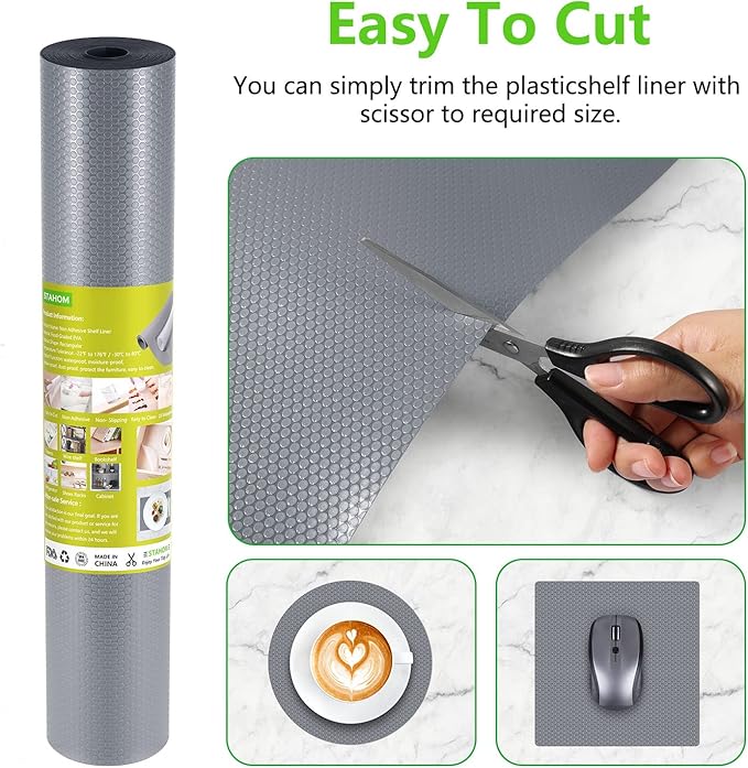 - 🍀【MULTIFUNCTIONAL LINER】 The waterproof shelf liner can not only be used as a kitchen liner to ensure the clean of the home, but also as a refrigerator mat to keep food and fruits fresh. Various Usage: Cabinet mat, drawer mat, desk mat, table mat, shelf liner, countertop.