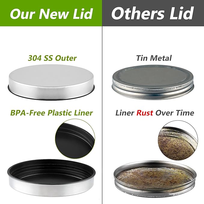 - Upgraded Lid: Different from tin metal lid, this anti-rust lid adopts 304 Stainless steel outer and food-grade plastic liner. There will be no any rust-problems