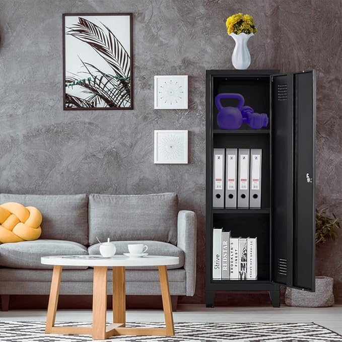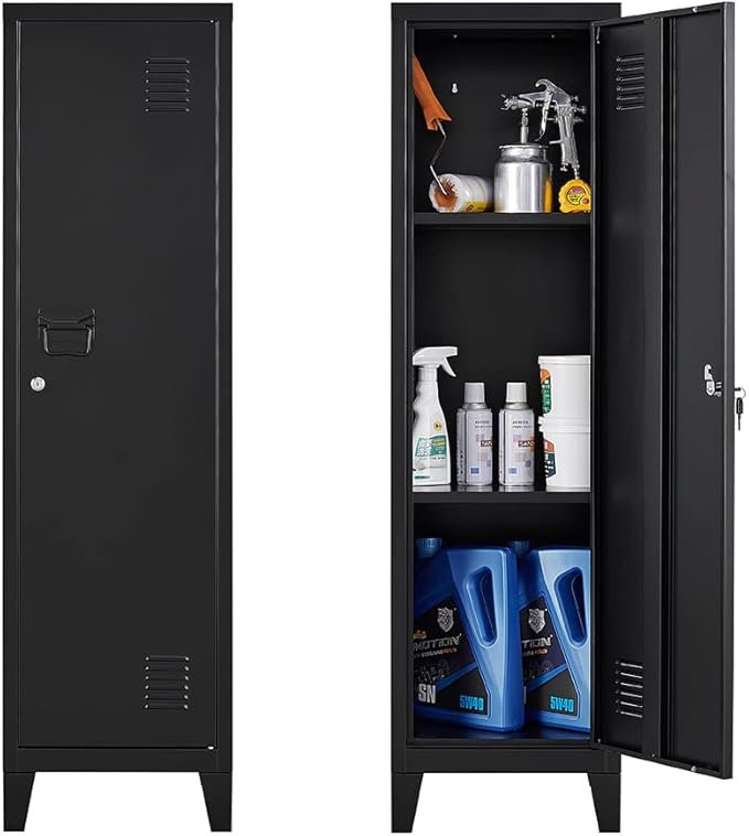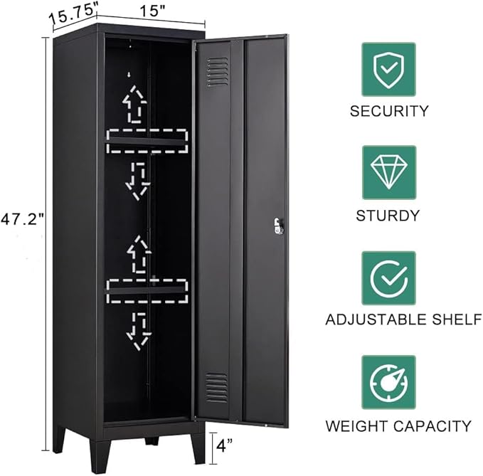 - FEATURES - 2 ADJUSTABLE SHELVES of the metal storage locker provide better adaptability and convenience for different height items; LOCK AND TWO KEYS INCLUDED which prevent unauthorized access. BREATHABLE VENT Keep your stuff dry and aired, eliminates odors and prevents moisture.