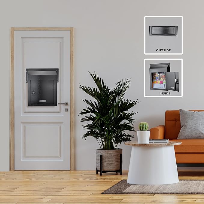 - RAINPROOF DESIGN: Keep your items dry and protected with our rainproof lock mailbox for doors! The extended hood on the mail slot ensures that you will not have to deal with wet and ruined mail ever again.