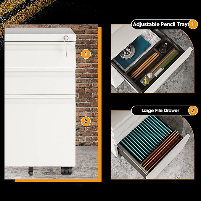 - Add More Mobility: Rolling file cabinet design with 2 front casters with braking function and 1 center caster to prevent tipping.