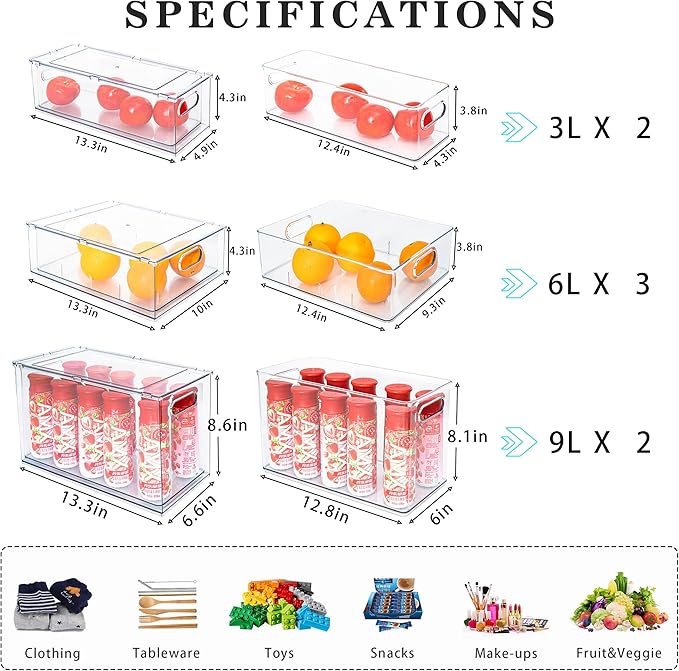 - Size: 7 pack fridge organizer is includes 2 pcs small size, 3 pcs middle size, 2 pcs large size. The small size is: 13.39 L X 4.96 W X 4.33 H inches, the middle size is: 13.39 L X 10.04 W X 4.33H inches, the large size is: 13.39 L X 6.69 W X 8.66 H inches