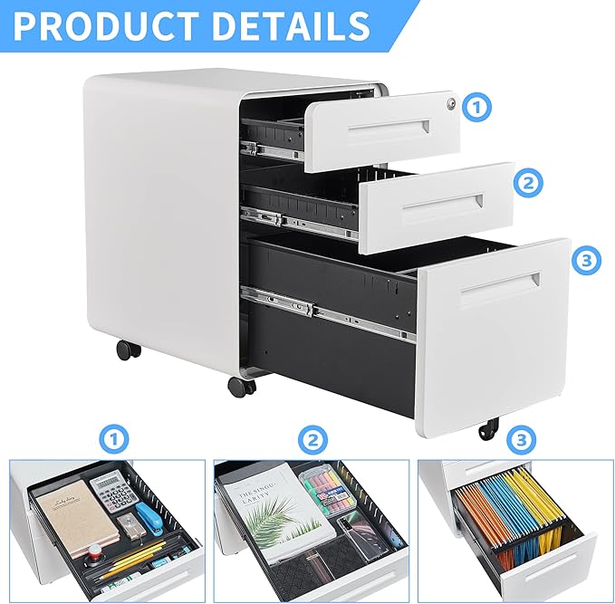 - 【Sturdy and Beautiful】File cabinet with high-strength cold-rolled steel frame, powder-coated immune to corrosion and rust; Modern delicate appearance and fit height make it can be placed under desk perfect for your home or office use.