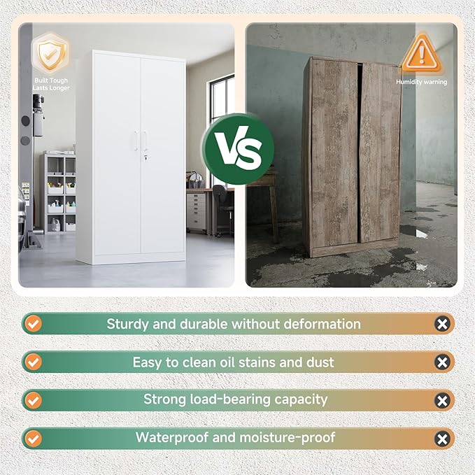 - High-Quality Metal: Letaya metal storage cabinet with whole-in-one reinforced heavy gauge steel deluxe welded frame, 2 locking doors are also strengthened by with additional steel bars, whole steel frame thickness up to 0.8 mm, rugged and not easily deformed, plate adopted environmentally powder coated finish, Moisture proof,capacity to resist corrosion and rust,Can be used for a long time