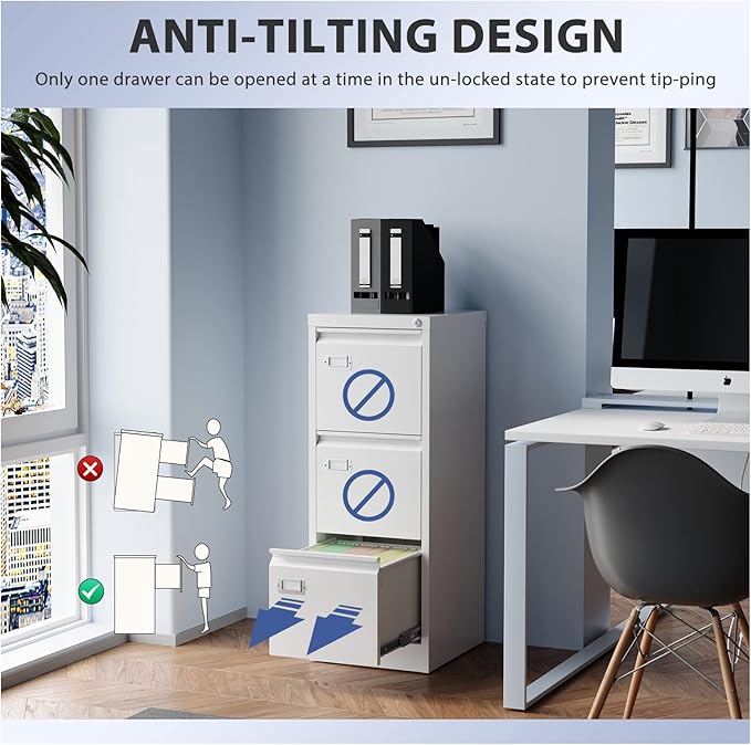 - 【Anti-Tilt Design】This office file cabinets has a lock that can lock all three drawers and comes with two keys. It helps you keep your valuables and documents safe. In the unlocked state, only one drawer can be pulled out at a time, preventing the movement of multiple drawers causing the overall center to shift and the box to fall.