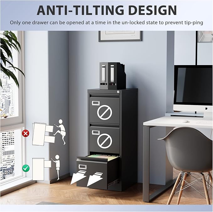 - 【Anti-Tilt Design】This office file cabinets has a lock that can lock all three drawers and comes with two keys. It helps you keep your valuables and documents safe. In the unlocked state, only one drawer can be pulled out at a time, preventing the movement of multiple drawers causing the overall center to shift and the box to fall.