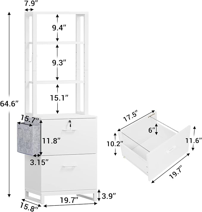 - 【Ample Storage Space】 19.68" L x 15.7"W x 64.56" H file cabinet is perfect for your home office. 6 tier shelf tall file cabinet provides enough room to hold bookshelf, printer, photocopier, etc. And side storage bag can hold books, file for your home office. The hook can be used to hang headphones, cap, etc.