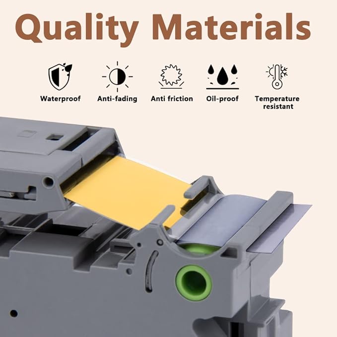 - Product features : Split back, water resistant, fading resistant, abrasion resistant, temperature resistant, strong adhesive. This compatibel label tape 24mm TZe-354 Gold ink on black is suitable for indoor and outdoor use