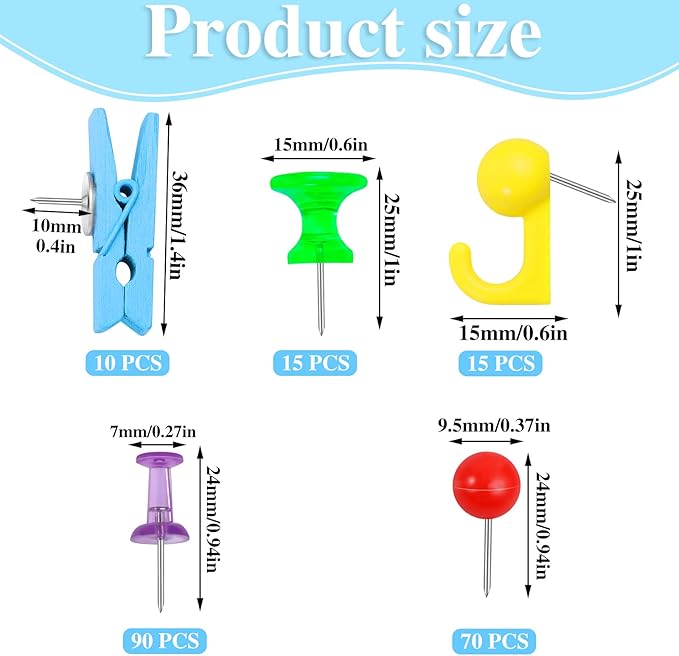 - 【Variety of Styles】You will receive 200Pcs push pins of 5 types in a plastic box, includes 10 wooden clips pins, 15 big size clear I-shaped map marking pins, 90 small size colors I-shaped map marking pins, 15 push pin hooks, 70 roundness thumb tacks. Ample quantity and rich styles are enough to meet your daily needs.