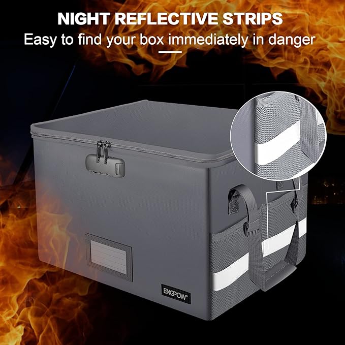 - Dust-proof and reflective strip design:Are you still worried about the storage box is often covered with dust? The dust-proof material can prevent dust from sticking to the outside of our fireproof box, always keep it neat and tidy.The reflective strip design on the side of the box allows you to immediately find your fireproof box even at night, protecting irreplaceable documents and valuables from fire.