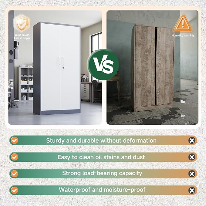 - High-Quality Metal: Letaya metal storage cabinet with whole-in-one reinforced heavy gauge steel deluxe welded frame, 2 locking doors are also strengthened by with additional steel bars, whole steel frame thickness up to 0.8 mm, rugged and not easily deformed, plate adopted environmentally powder coated finish, Moisture proof,capacity to resist corrosion and rust,Can be used for a long time