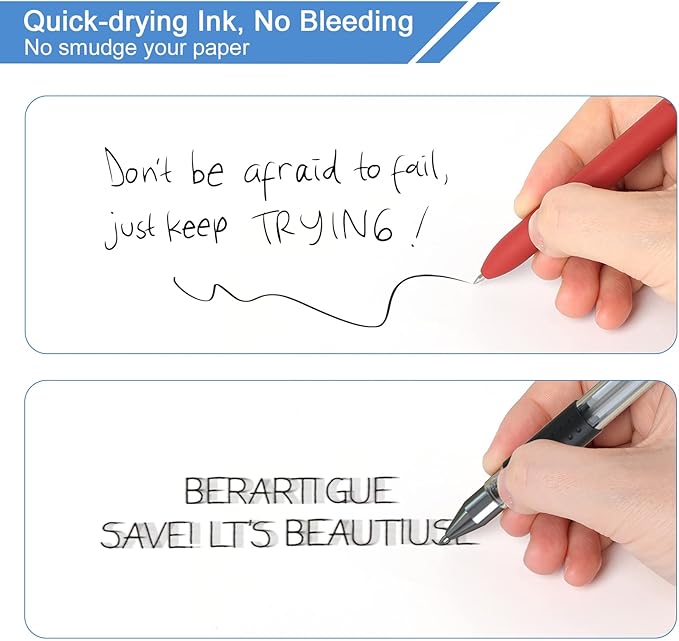 - 0.5mm Quick-Drying Ink Pens:Retractable Rolling Ball Gel Pens with fade-resistant ink, there’s no need to worry about getting ink on your hands or desk, as it won’t fade, bleed, or smudge. Note: After using the gel pen, it is suggested to lay the pen flat or the nib face up. This helps protect the pen tip