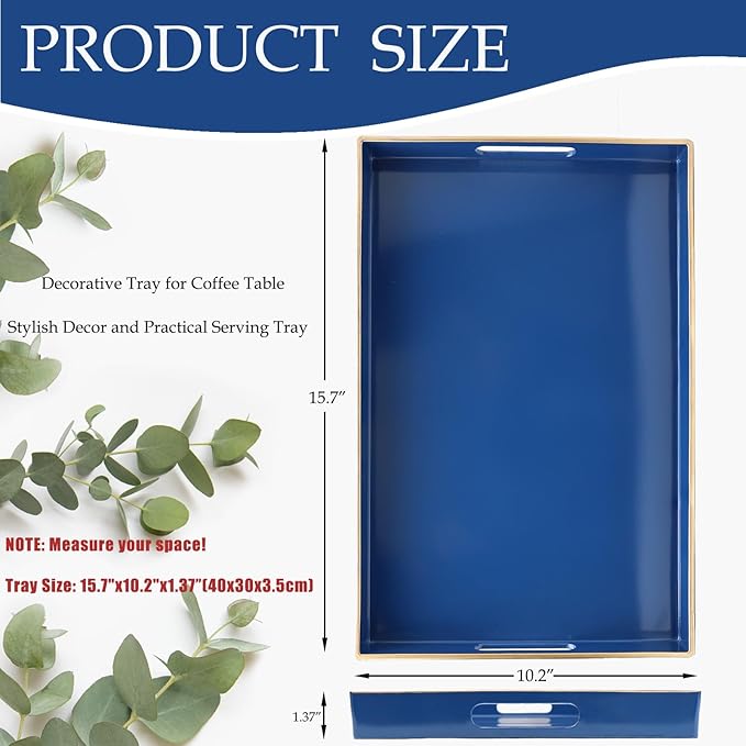 Spsyrine Blue Decorative Serving Tray with Handles, Elegant Plastic Coffee Table Tray for Ottoman, Living Room, Home Decor 15.6" X 10.2"