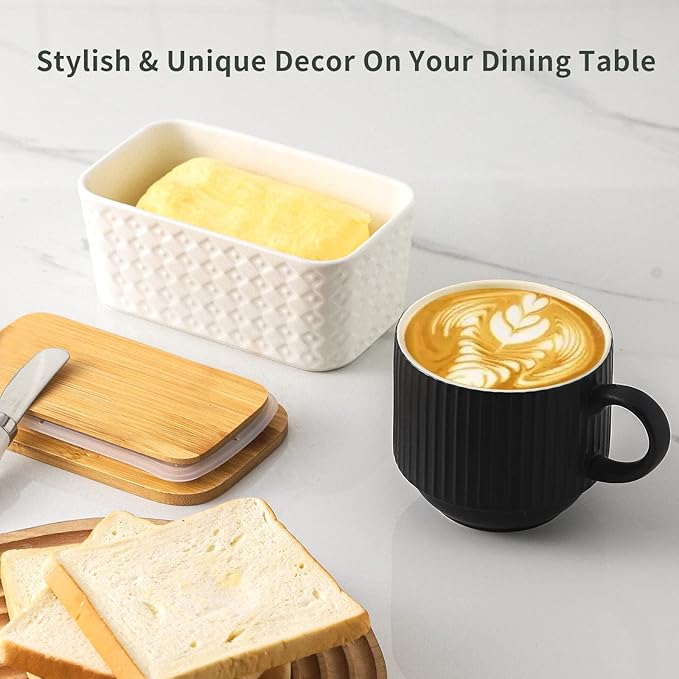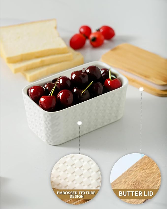 - Unique Embossed Texture Design: The ceramic butter dish for countertop with fancy embossed pattern adds fashion to your kitchen and makes you enjoyable dining time. This wide butter dish with lid combines functionality with attractive aesthetics