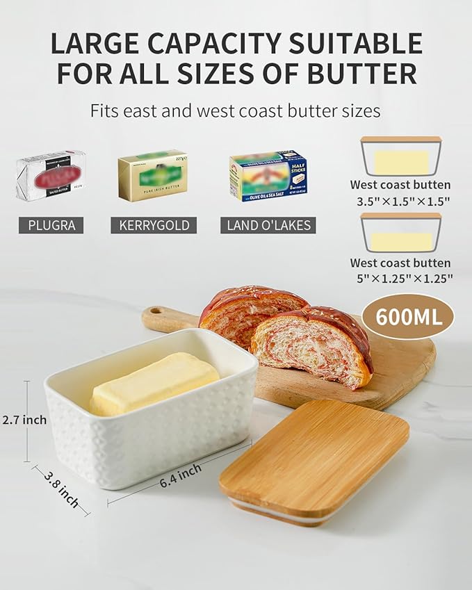 - Suitable For Many Butter Brand: The dimension of large butter container with cover is about 6.4 x 2.8 x 3.8 inch, which is large enough to hold a standard butter stick of Kerrygold, Plugra, Land O Lakes and more