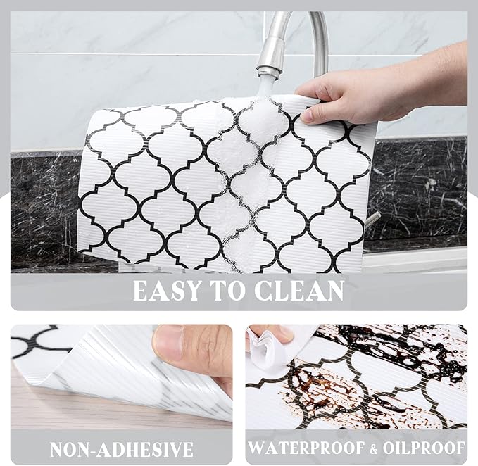 - π WATERPROOF AND EASY-TO-CLEAN KITCHEN CABINET LINERS-These storage shelf liners are waterproof and dust-proof, which keeps belongings in your kitchen cabinet, fridge and drawer organized and protected from grease and spills. The non-adhesive shelf liners are easily removable and can be cleaned with mild soap and water.