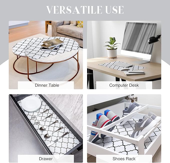 - π NON SLIP CABINET LINERS FOR SHELVES- Measured 24β x 20 ft. with a non-slip double-sided mat, this kitchen drawer liners help prevent spills in storage spaces by keeping your items locked in place and free from unwanted dirt and debris. The quatrefoil design of this wire shelf liner is not only beautiful but also effective to secure your belongings on the wire shelf, glass shelves and so on.
