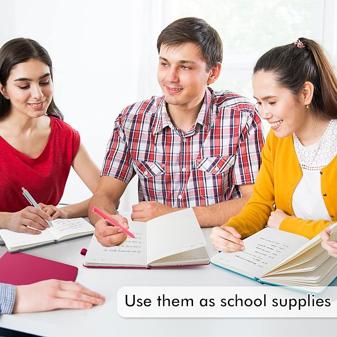 - 3 different solid colors for these notebooks, Gray, Berry, Emerald. There are 3 Black Retractable Pens in the box. You can use it as soon as you receive it. These pens are perfect to be put in the pen holder of the classic ruled notebook. Large tube has the capacity of restoring more ink, which makes them long lasting. Quick drying can avoid smearing and smudge.