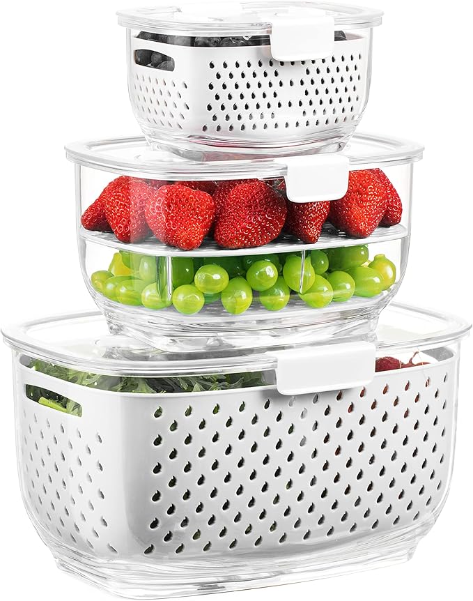 - MULTIFUNCTIONAL DESIGN: The bottom of the container has small opening that can be opened to drain out water and can also be used as colander to wash produce or strain food such as potatoes. The filter tray at the bottom is used to elevate food from the moisture hence can be used as storage after cleaning without changing containers. Filtering out the water on the surface of vegetables and fruits to reduces spoilage of the food.