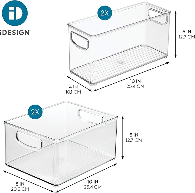 iDesign 4-Piece 50% Recycled Plastic Organizer Bin Set for Pantry and Cabinet Organization, Made in The USA – Two 10” x 8” x 5” and Two 10” x 4” x 5” Bins, Clear