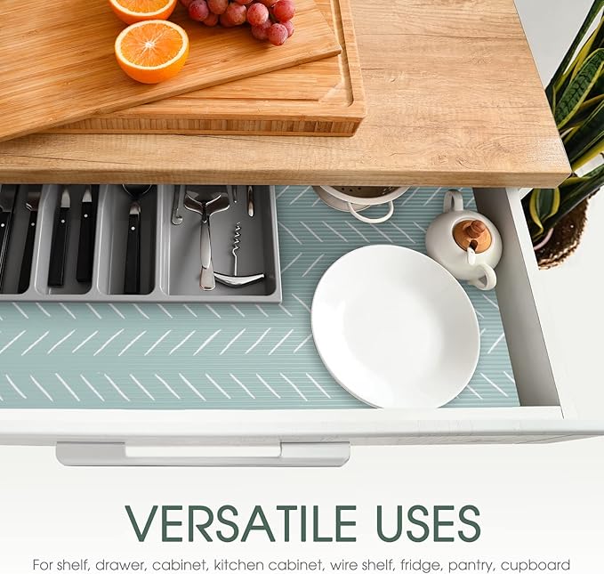 - Waterproof and Easy to Clean Kitchen Cabinet Liner:These storage shelf liners are waterproof and dust-proof which keeps belongings in your kitchen cabinet, fridge and drawer organized and protected from grease and spills. The non-adhesive shelf liners are easily removable and can be cleaned with mild soap and water
