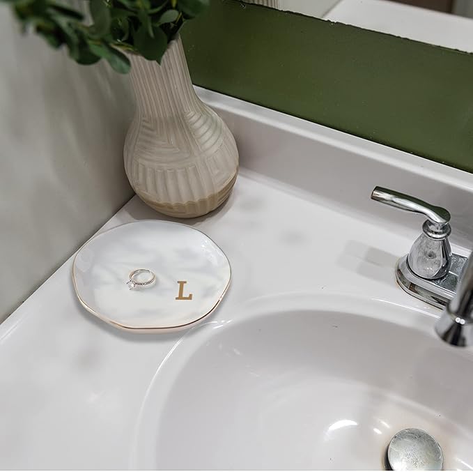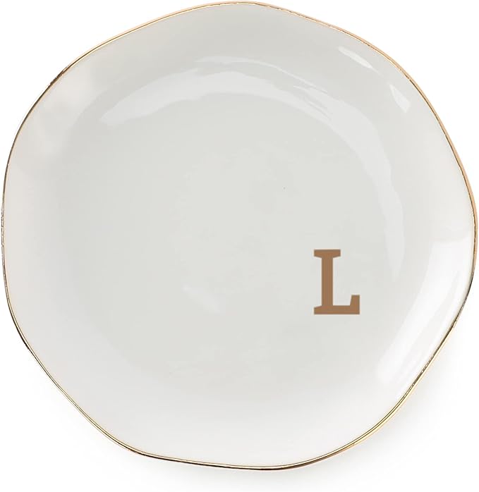 Initials Ring Dish Jewery Tray with personalized L-Monogrammed Gifts Wedding Engagement for Women Friends sister,Ceramic White
