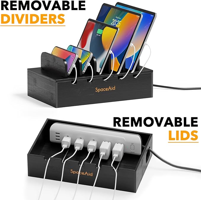 SpaceAid Bamboo Charging Station for Multiple Devices, Cell Phone Docking Stations for Multi Laptop, Tablets and iPads, Nightstand Bedside Desk Device Charger Organizer (Black)
