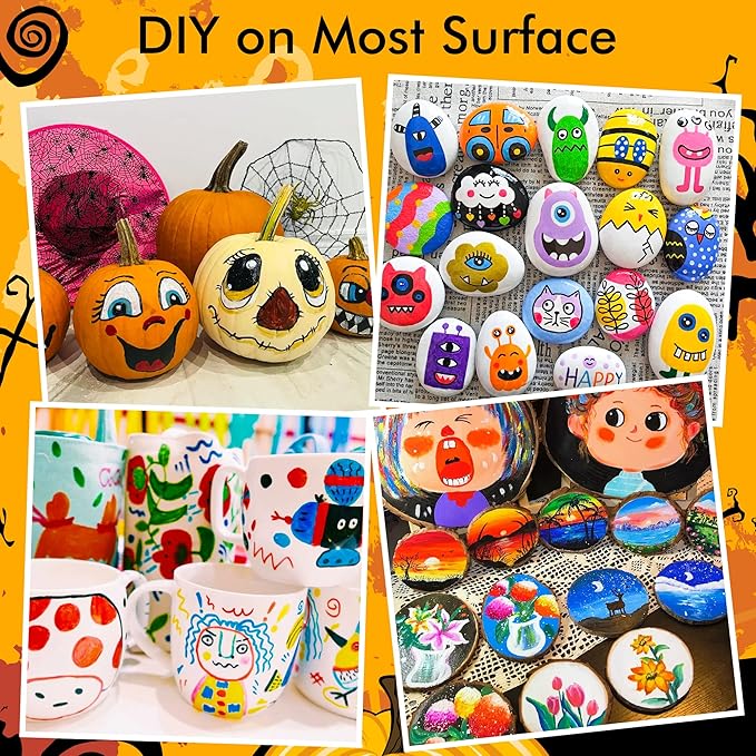 - 【MULTI-PURPOSE】: Enjoy creating art projects on a variety of surfaces, acrylic paint marker set suitable for rock painting, ceramic and mug painting, glass and wine glass painting, wood, fabric, stone, metal, plastic, canvas, Christmas ornament, Halloween pumpkin painting, calligraphy, scrapbook, bullet journal, brush lettering, custom mugs, DIY crafts projects, and much more for both smooth and porous surfaces.
