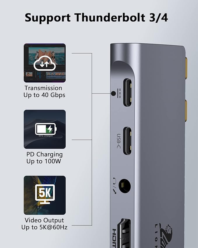 - 【A Multifunctional USB-C port compatible with Thunderbolt 3/4 】In this Macbook Pro dongle,one USB-C Port compatible with Thunderbolt 3/4 supports data transfer up to 40Gb/s, up to 5K displays, up to 100W power; It and HDMI port can be used simultaneously to support dual monitor display ,to mirror or extend your laptop's display to your TV, monitor or projector[Note: For M1M2M3 , this macbook accessories does not support dual display. Another usb c port is only for data transfer, speed usb 3.0 ]