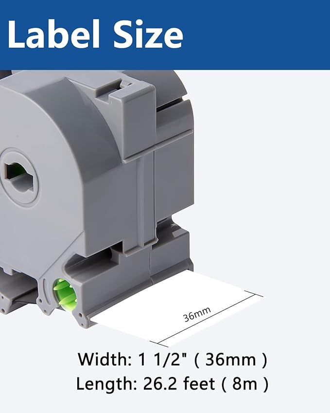 - Size - 1 1/2" width x 26.2' length ( 36mm x 8m ) each 36mm clear label maker tape. Color - Black ink on clear tape
