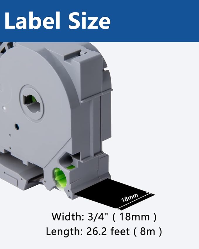 - Size - 3/4" width x 26.2' length ( 18mm x 8m ) each 18mm label maker tape. Color - White ink on black tape