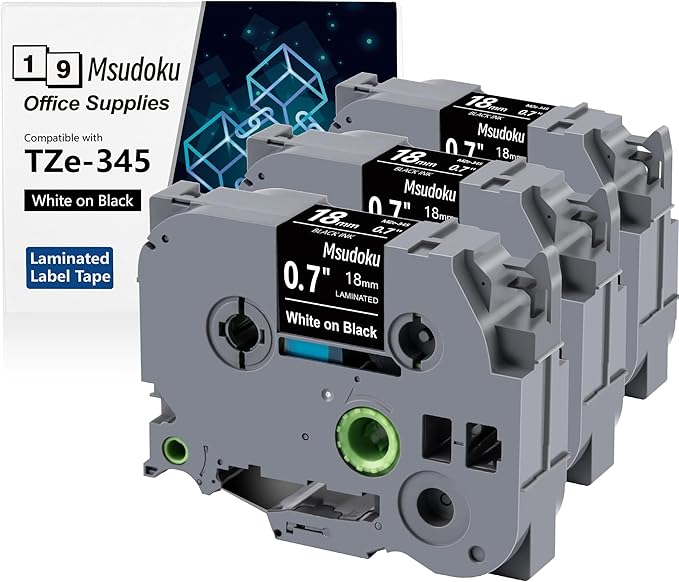 - These compatible for brother label maker tape 18mm 0.7 TZe-345 TZe345 have strong adhesive and no sticky residue when you remove it. The split back design of ptouch label tape 18mm black tape is very easy to peel off