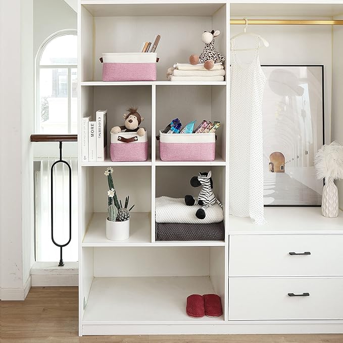 OrganiHaus Small Fabric Storage Baskets for Shelves 3 Pack, 12x08in Closet Storage Bins for Shelves, Canvas Baskets for Organizing, Linen Closet Organizers, Cloth Basket, Pink/Off-White